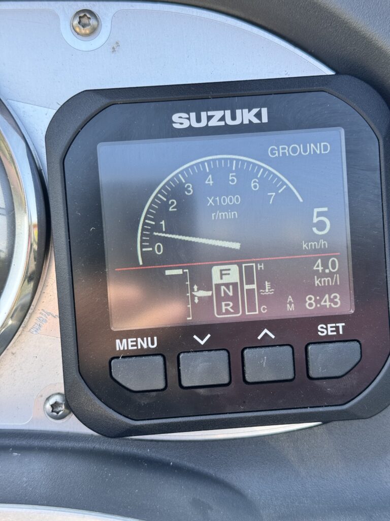 オプションのマルチファンクションゲージ(デジタルメーター)とGPSユニットなどを付けたのですが、これがあればGPS読みの速度、回転数、エンジン温度、バッテリー電圧、残燃料、燃料消費(燃費)、トリム角などの情報が全部見れます。